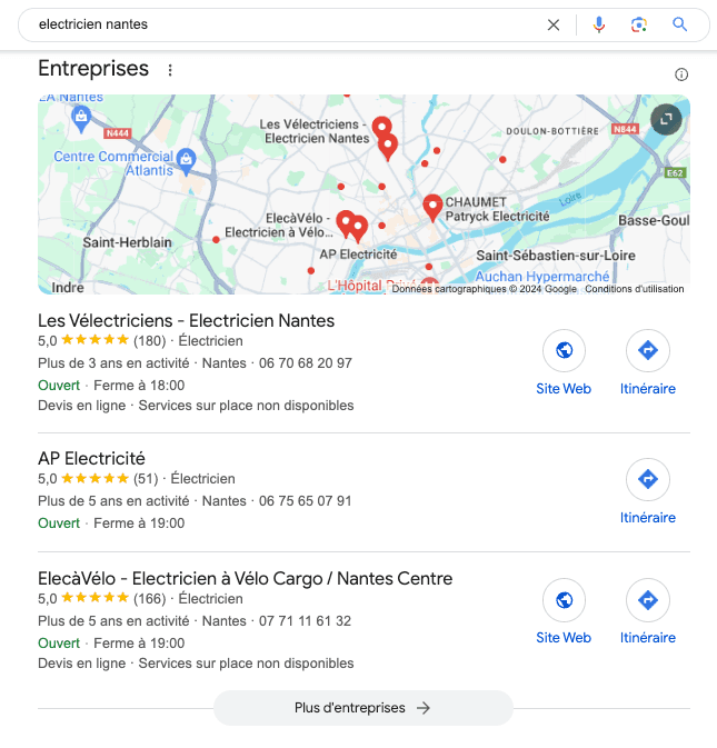 Par exemple, si, en tant qu’artisan électricien situé à Nantes, tu optimises ta fiche Google pour le référencement local, ta fiche pourra être mise en avant lorsqu’un client potentiel effectuera la requête « électricien Nantes ».