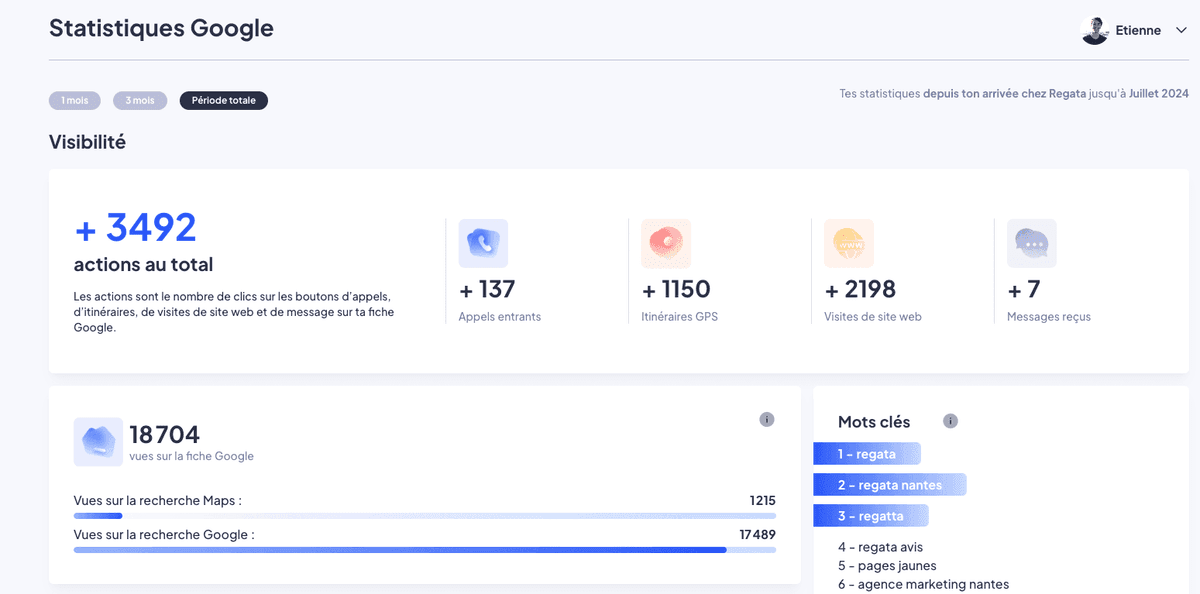 💡 Bon à savoir : si tu utilises la plateforme Regata pour améliorer ta visibilité locale et ta réputation en ligne, tu peux observer et suivre l’évolution de ces indicateurs en un coup d’œil en te rendant dans l’onglet « statistiques ».