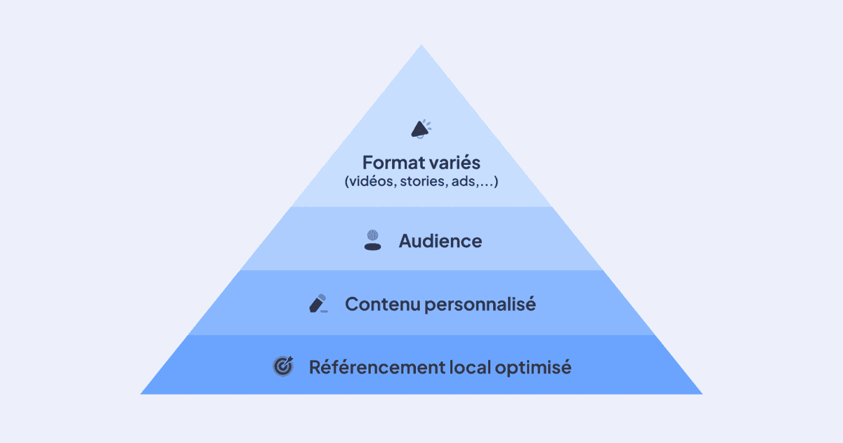 C'est ici que la pyramide de la visibilité de Regata entre en jeu pour prioriser tes efforts. La pyramide te guide à travers les étapes nécessaires pour atteindre une visibilité optimale :